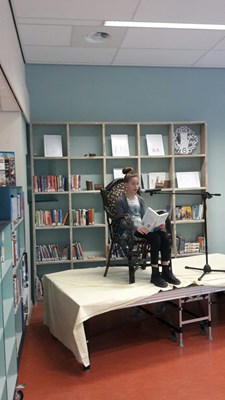 In de groepen 7 en 8 is vorige week de jaarlijkse voorleeswedstrijd gehouden. De winnaars vanuit elke klas mochten afgelopen dinsdag aan alle kinderen van de groepen laten horen waarom zij de klassenwinnaars waren. De winnaar van groep 7 was Per, uit groep 8a waren het Tjitske en Rosanna die de eer mochten verdedigen en voor groep 8b gingen Joep en Dieuwertje de strijd aan. Nadat ze alle vijf hun uiterste best gedaan hadden, werd het voor de jury een lastige taak om een winnaar te kiezen. Tjitske Koppes is onze schoolkampioen geworden. Zij mag onze school vertegenwoordigen tijdens de voorleeswedstrijd in de bibliotheek van Heiloo. De achtergrond was dit jaar heel toepasselijk: de prachtige steigerhoutenkast van de nieuwe bibliotheek.